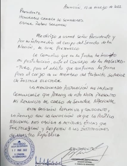 Tras postularse al cargo de ministro del Tribunal Superior de Justicia Electoral (TSJE), el legislador Juan Bartolomé “Ancho” Ramírez, presentó este jueves su renuncia, ante el presidente de la Cámara de Senadores, Óscar Cachito Salomón.
