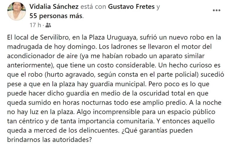 La propietaria de Servilibro, ubicada en la Plaza Uruguaya, analiza abandonar su puesto debido a la inseguridad que se apoderó del sitio y se perpetró un robo por quinta ocasión. Desde la Policía Nacional alegan que es difícil evitar los casos porque no tienen acompañamiento de la Justicia.