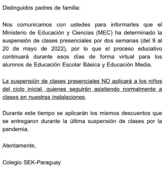 El MEC “ha determinado la suspensión de clases presenciales por dos semanas (del 9 al 22 de mayo de 2022), por lo que el proceso educativo continuará durante esos días de forma virtual para los alumnos de Educación Escolar Básica y Educación Media”, indica el escrito remitido a padres al que accedió RDN. “La suspensión de clases presenciales NO aplicará a los niños del ciclo inicial, quienes seguirán asistiendo normalmente a clases en nuestras instalaciones”, agrega el texto. Además, menciona que se aplicarán descuentos como ocurrió durante la pandemia.