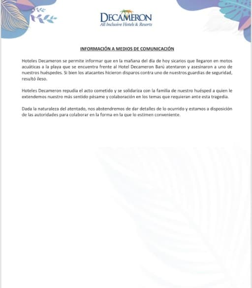 “Hoteles Decameron se permite informar que en la mañana de hoy sicarios que llegaron en motos acuáticas a la Playa que se encuentra frente al Hotel Decameron Barú atentaron y asesinaron a uno de nuestros huéspedes. Si bien los atacantes hicieron los disparos contra uno de nuestros guardias de seguridad, resultó ileso”, menciona el escrito.