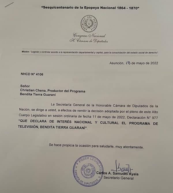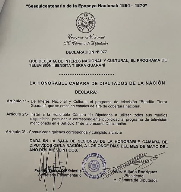 La Declaración fue aprobada por el pleno de la Honorable Cámara de Diputados en la sesión ordinaria del pasado 11 de mayo. En lo resuelto se dispone “utilizar todos los medios disponibles para dar la correspondiente publicidad al programa de televisión”.