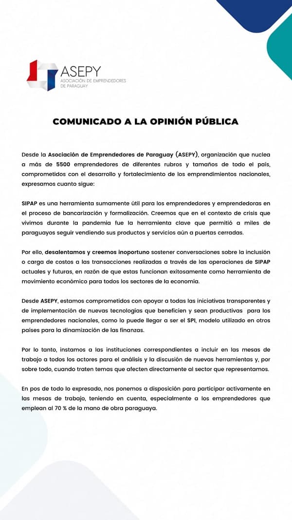 Uno de ellos fue la Asociación de Emprendedores del Paraguay (ASEPY). El grupo rechaza y cree inoportuno el diálogo sobre la inclusión de costos a las transferencias, pues ya funcionan actualmente “como herramienta de movimiento económico para todos los sectores de la economía”.