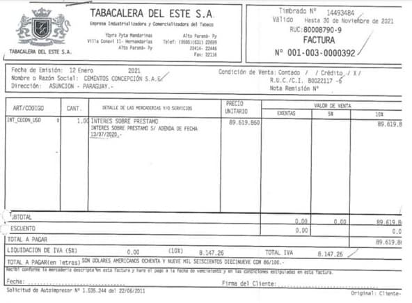 “Los directivos de Tabesa dieron a conocer algunas de las verdaderas facturas emitidas por esta firma a Cementos Concepción SAE. (Cecon), por varios montos, aludidas por 'la filtración' de los medios aliados a una feroz operación del Gobierno de turno, en contra del Grupo Cartes, tratando de montar y vender una falsedad como un hecho”, menciona el artículo.