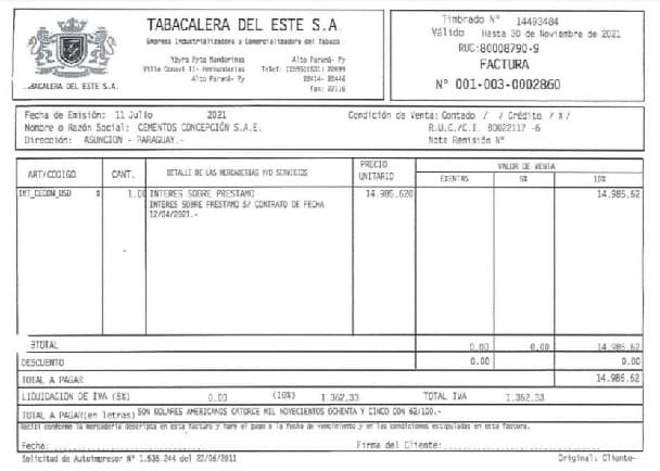 Fueron tres facturas expuestas, de las cuales dos de ellas tienen como descripción “Interés sobre préstamo” y la tercera, se trata del “servicio de implementación del sistema informático”, que la Tabacalera facturó como servicio a Cecon.