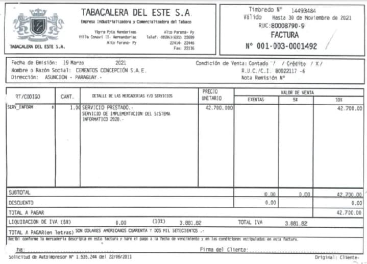 En la tarde de este lunes fueron entregadas muestras de las facturas que Tabacalera del Este S.A. (Tabesa) emitió a Cementos Concepción (Cecon), por mencionar una firma aludida en el curso de los años a los que aplica el “estudio” de la Seprelad.