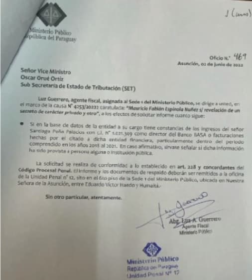 La nota está firmada por la agente fiscal Luz Guerrero. En el escrito se consulta a la SET si cuenta con información sobre los ingresos del precandidato a la Presidencia del movimiento, Honor Colorado, liderado por el expresidente de la República, Horacio Cartes, quien está en la mira desde la filtración de un informe de la Secretaría de Prevención de Lavado de Dinero o Bienes (Seprelad).