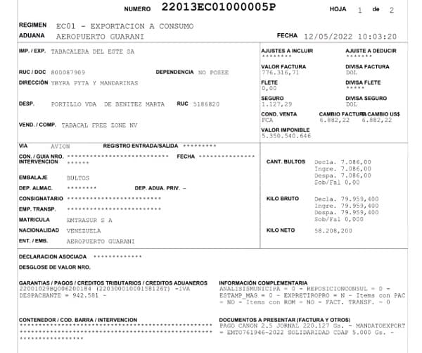 El 13 de mayo pasado, la aeronave llegó desde Venezuela hasta el aeropuerto Guaraní de Minga Guazú. Los tripulantes estuvieron cuatro días por Ciudad del Este, recogieron las mercaderías de Tabacalera del Este (Tabesa), propiedad del expresidente de la República, Horacio Cartes y fueron a Aruba.