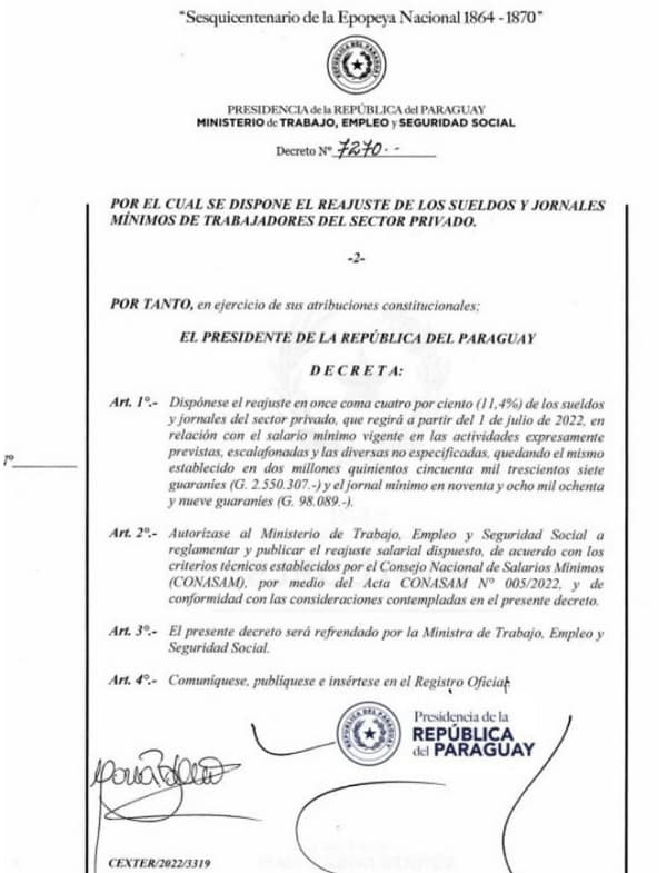 El primer artículo señala lo siguiente: “Dispónese el reajuste en once coma cuatro por ciento (11,4%) de los sueldos y jornales del sector privado, que regirá a partir del 1 de julio de 2022, en relación con el salario mínimo vigente en las actividades expresamente previstas, escalafonadas y las diversas no especificadas, quedando el mismo establecido en dos millones quinientos cincuenta mil trescientos siete guaraníes (G. 2.550.307.-) y el jornal mínimo en noventa y ocho mil ochenta y nueve guaraníes (G. 98.089.-)”.