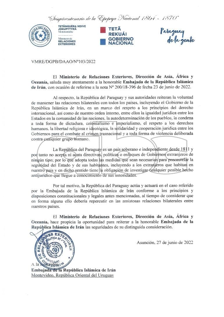 Finalmente, la nota refiere: “La República del Paraguay actúa y actuará en el caso referido por la Embajada de la República Islámica de Irán conforme a los principios y disposiciones constitucionales y legales antes mencionadas, al tiempo de considerar que en forma alguna ello debería repercutir en las amistosas relaciones bilaterales entre nuestros países”.