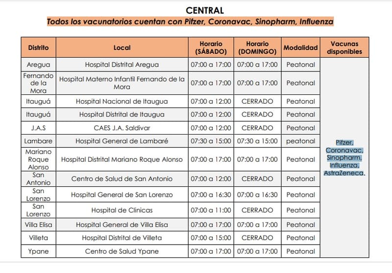 En el departamento Central están habilitados los siguientes vacunatorios: Hospital Distrital Areguá, Hospital Materno Infantil Fernando de la Mora, Hospital Distrital Mariano Roque Alonso, Hospital General de Villa Elisa, Centro de Salud Ypané, de 07:00 a 17:00. En el Hospital General de Lambaré, la atención es hasta las 15:00, mientras que en el Hospital General de San Lorenzo la vacunación se hará hasta las 16:30. Todos atienden en la modalidad peatonal y cuentan con Pfizer, Coronavac, Sinopharm, Influenza, AstraZeneca.