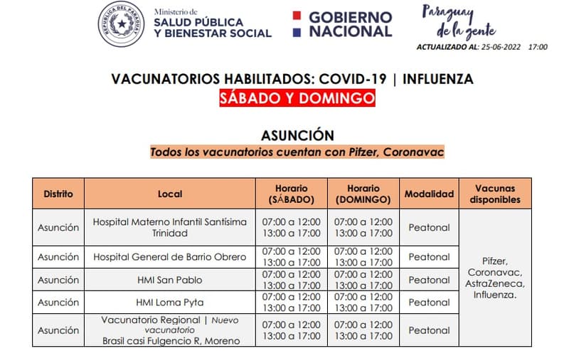 En Asunción, atienden al público este domingo, los vacunatorios del: Hospital Materno Infantil Santísima Trinidad, Hospital General de Barrio Obrero, HMI San Pablo, HMI Loma Pyta, Vacunatorio Regional (nuevo vacunatorio) Brasil casi Fulgencio R. Moreno, todos atienden de 07:00 a 12:00 y de 13:00 a 17:00, en la modalidad peatonal y cuentan con Pfizer, Coronavac, AstraZeneca y la Anti Influenza.