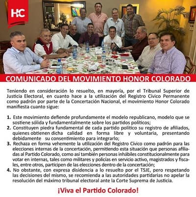 Mediante un comunicado, HC confirmó que dejará de oponerse a la cuestión. “Rechaza en forma vehemente la utilización del Registro Cívico como padrón para las elecciones internas de la concertación, permitiendo esta situación que personas afiliadas al Partido Colorado, como así también personas inhábiles constitucionalmente para votar en internas, tales como militares y policías en servicio activo, magistrados y fiscales, entre otros, participen de las elecciones dentro de la concertación”, indica parte del texto.