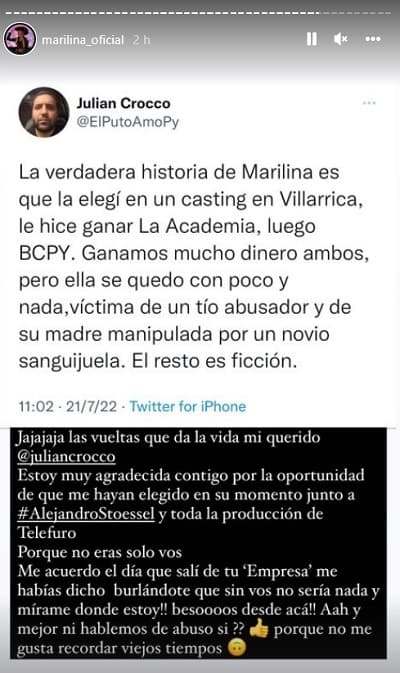 “La verdadera historia de Marilina es que la elegí en un casting en Villarrica, le hice ganar La Academia, luego BCPY. Ganamos mucho dinero ambos, pero ella se quedo con poco y nada,víctima de un tío abusador y de su madre manipulada por un novio sanguijuela. El resto es ficción (sic)”, fue el tuit que encendió la mecha este jueves.
