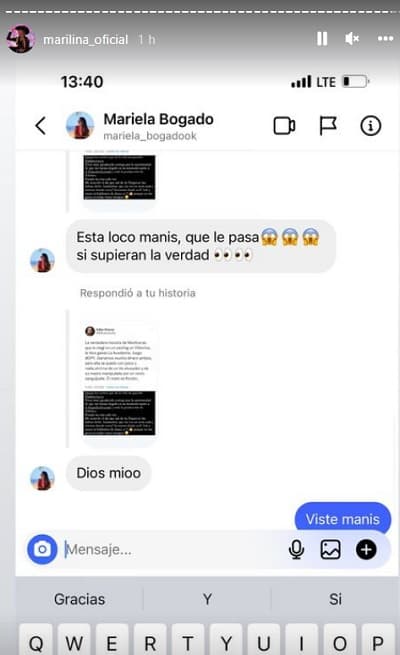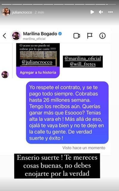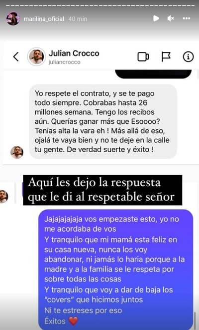 Marilina no dudó en responder y comenzó un ida y vuelta en historias de Instagram que llegó a un punto cumbre cuando el productor acusó de apropiación a la artista.