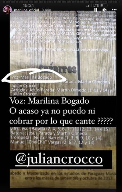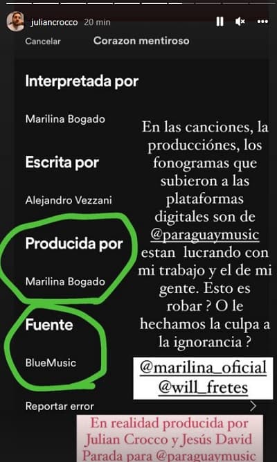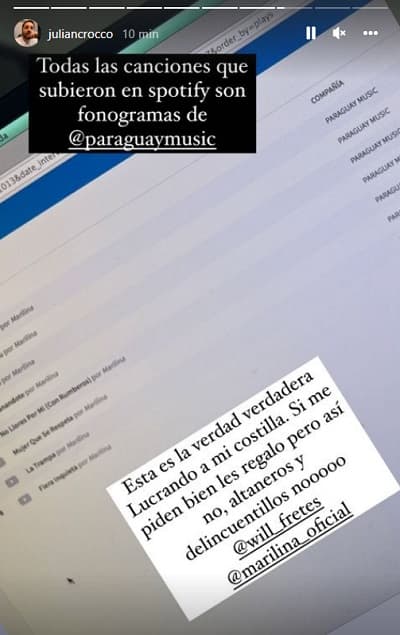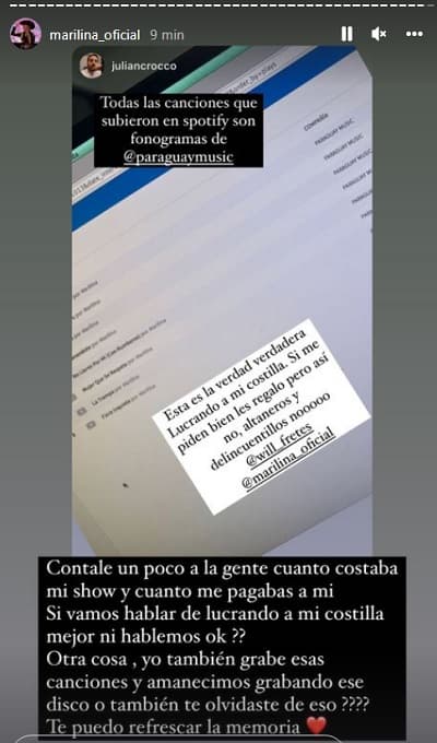 Crocco aseguró que la cantante subió temas musicales a plataformas digitales cuyos fonogramas pertenecen a la firma que encabeza. Además, le hizo mención que ella percibía la suma de G. 26 millones por semana, entre otras cosas.
