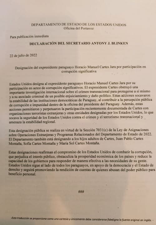 “El Secretario de Estado, Antony Blinken, anunció la designación pública del expresidente Horacio Cartes debido a su participación en actos de corrupción significativos”, comenzó diciendo el embajador. “La designación de Horacio Cartes hace que, como cuestión general, Cartes y sus familiares inmediatos, Juan Pablo Cartes Montaña, Sofía Cartes Montaña y María Sol Cartes Montaña no sean elegibles para ingresar a los Estados Unidos”, agregó posteriormente. Pero eso no fue todo, considerando que el embajador dijo que HC utilizó la Presidencia de la República para apañar hechos ilícitos. “Durante su mandato, Horacio Cartes utilizó la Presidencia de la República del Paraguay para obstruir una investigación del crimen trasnacional que involucraba a su socio”, detalló y posteriormente explicó: “La obstrucción de Cartes fue diseñada para mitigar el riesgo político y legal para sí mismo”.