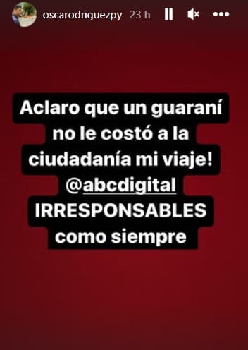 Seguidamente hay un mensaje que dice: “Aclaro que un guaraní no le costó a la ciudadanía mi viaje! @abcdigital IRRESPONSABLES como siempre”.