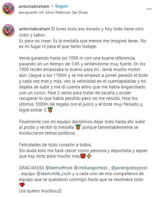 Este jueves, Antonia Abraham, doble campeona panamericana en Lima 2019, dio a conocer su versión en su cuenta en Instagram y aseguró que se presentaron “temas políticos”.