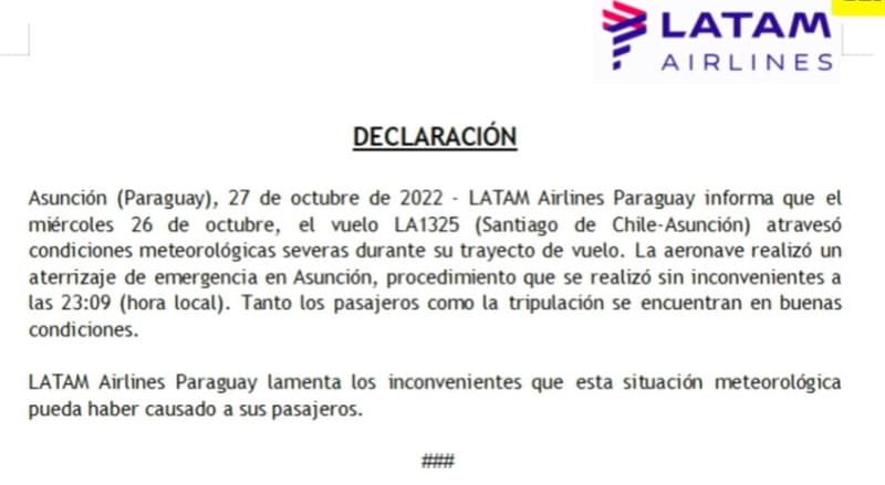 “LATAM Airlines Paraguay informa que el miércoles 26 de octubre, el vuelo LA1325 (Santiago de Chile-Asunción) atravesó condiciones meteorológicas severas durante su trayecto de vuelo. La aeronave realizó un aterrizaje de emergencia en Asunción, procedimiento que se realizó sin inconvenientes a las 23:09 (hora local). Tanto los pasajeros como la tripulación se encuentran en buenas condiciones”, menciona.