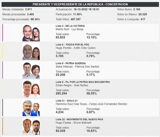 De acuerdo al conteo del Tribunal Superior de Justicia Electoral (TSJE), con cerca del 90% de los votos escrutados, Efraín y Sole consiguieron 58% de los votos, es decir alrededor de 280 mil votos, al momento de esta publicación. La dupla en segundo lugar apenas consiguió el 17%, es decir alrededor de 80 mil votos, con una diferencia próxima a los 200 mil votos.