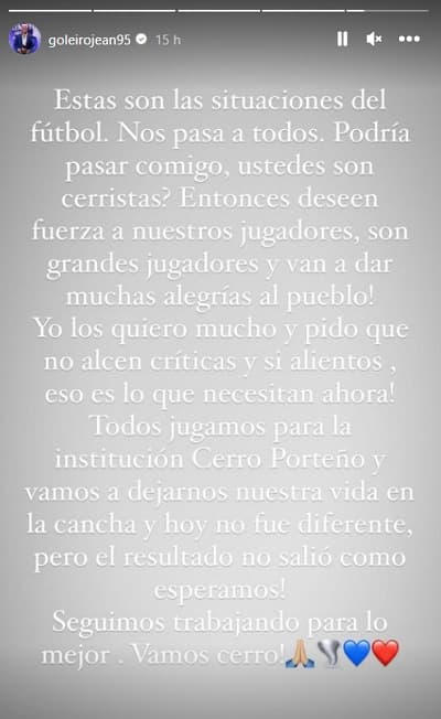 Tras el duelo, Jean lanzó un mensaje en redes sociales pidiendo aliento, antes que críticas. “Estas son las situaciones del fútbol. Nos pasa a todos. Podría pasar conmigo, ustedes son cerristas? Entonces deseen fuerza a nuestros jugadores, son grandes jugadores y van a dar muchas alegrías al pueblo!”, indica parte del texto.