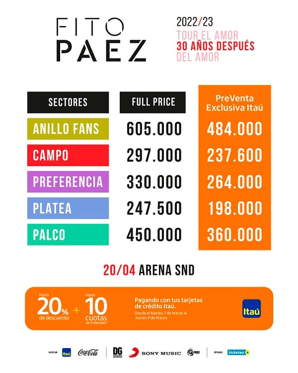 La preventa será a partir del 7 de marzo desde las 00:00, exclusivamente para clientes del banco Itaú, quienes accederán a un 20% de descuento y hasta 10 cuotas sin intereses.