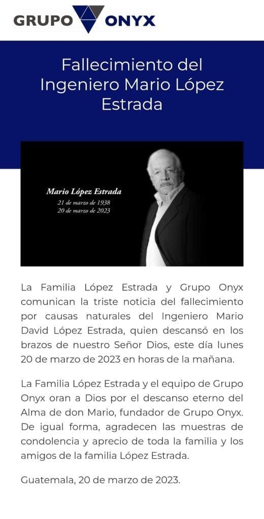 “La Familia López Estrada y el equipo de Grupo Onyx oran a Dios por el descanso eterno del Alma de don Mario, fundador de Grupo Onyx. De igual forma, agradecen las muestras de condolencia y aprecio de toda la familia y los amigos de la familia López Estrada”, detalla la publicación.