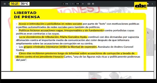 En ese sentido, entre los varios casos se hizo mención “con nombre y apellido”, a la causa que lleva adelante la exministra de Tributación, Marta González Ayala, quien realizó dos demandas en contra de ABC Color, después de que el medio informara sobre acusaciones de corrupción en su contra.Asimismo, se menciona que el diario Cinco Días, recibieron presiones luego de informar acusaciones de corrupción y lavado de dinero contra el expresidente de la República Horacio Cartes, a quien consideran “una de las personas política y económicamente más poderosas del país”.