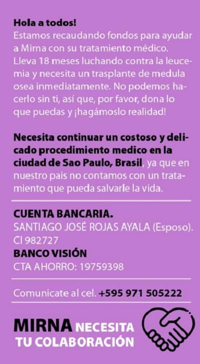 Para conseguir los fondos, los familiares de la paciente se encuentran trabajando y realizarán una actividad el próximo 7 de mayo, en el polideportivo del Colegio Immaculée Conception, ubicado en Teodoro S. Mongelós esquina Solar Guaraní, de Asunción. El Karu Guasu por Mirna comenzará a las 11:00 y la entrada costará G. 50.000.