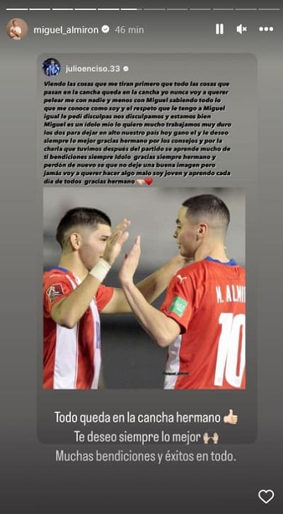 “Las cosas que pasan en la cancha se queda en la cancha, yo nunca voy a querer pelearme con nadie y menos con Miguel sabiendo todo lo que me conoce como soy y el respeto que le tengo”, publicó Enciso. “Le pedí disculpas, nos disculpamos y estamos bien”, tecleó para luego agregar que Almirón es un ídolo que tiene.