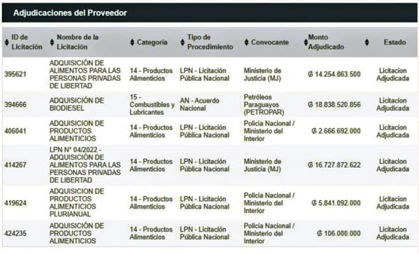 Entre los contratos millonarios de la empresa con el Estado, destaca uno con la Policía Nacional para la provisión de carnes por casi G. 6.000 millones, de los cuales ya se han pagado G. 4.800 millones. Este acuerdo se firmó en noviembre de 2022 y finaliza a fines de 2023.