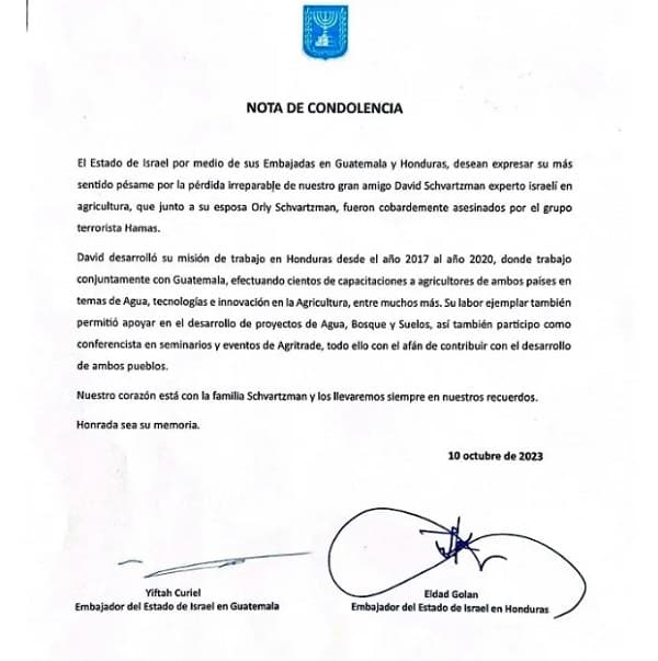 Yiftah Curiel y Eldad Golan, embajadores de Israel en Guatemala y Honduras respectivamente, habían anunciado las muertes de la pareja el 11 de octubre. Susi Schohet, compatriota residente en Israel, también confirmó la terrible noticia un día después.