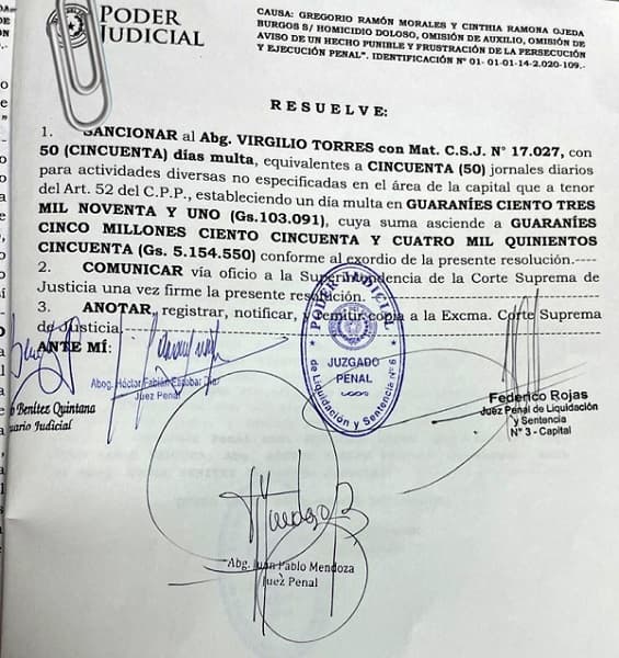 El abogado Virgilio Torres, representante legal de Gregorio “Papo” Morales, acusado por el asesinato de Robert Fabián Marín, ha sido sancionado por el Tribunal de Sentencia. La sanción, que asciende a G. 5.154.550, se debe a los intentos del letrado por entorpecer y dilatar el juicio con una recusación al colegiado.
