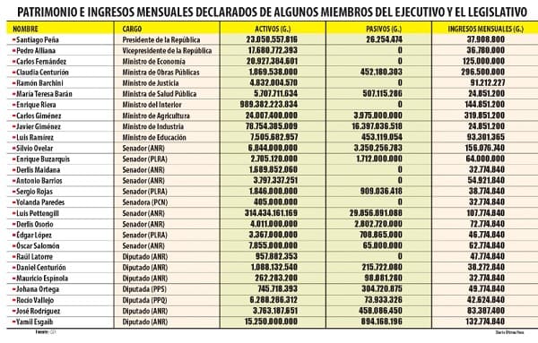 Según las declaraciones brindadas a la Contraloría General de la República (CGR) por el presidente de la República, Santiago Peña, su vicepresidente, Pedro Alliana, y principales ministros y legisladores, la mayoría de estos funcionarios cuenta con un importante patrimonio, además de obtener ingresos extras de sus negocios privados.