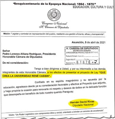 El proyecto fue presentado en la Cámara de Diputados el 5 de abril de 2021, solicitando el estudio, análisis y aprobación del “objetivo académico” conforme a las regulaciones establecidas por el Cones. La universidad llevaría el nombre de René Cassin, redactor de la Declaración Universal de los Derechos Humanos y premio Nobel de la paz, y tendría sede en Asunción.