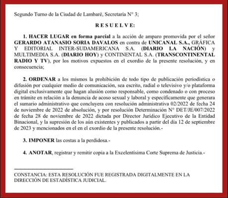 Es imposible no destacar la relevancia del reciente fallo en elcaso de Gerardo Atanasio Soria Dávalos contra conglomerados mediáticos vinculados al poderoso empresario y político Horacio Cartes.Unite a nuestro canal de WhatsAppLa resolución, que favorece a Soria, no solo esun triunfo personal, sino también un recordatorio oportuno sobre el papel de los medios en nuestra sociedad democrática.La causa de Gerardo Soria contra medios de comunicaciónEste caso emerge de la acusación de Soria Dávalos contra medios como Unicanal S.A. (representante de los medios de comunicación CANAL 13 (Grupo JBB) y UNICANAL (Grupo JBB), GRÁFICA Y EDITORIAL INTER-SUDAMERICANA S.A. (DIARIO LA NACIÓN), MULTIMEDIA S.A. (DIARIO HOY) y CONTINENTAL S.A. (TRANSCONTINENTAL RADIO Y TV).Opinión de la Dra. Alejandra PeraltaResulta pertinente saber la opinión de la Dra. Alejandra Peralta sobre el caso de Gerardo Soria contra varios medios de comunicación del Grupo Nación propiedad de la familia Cartes y del Grupo JBB del empresario Javier Bernardes Banti.La Dra. Peralta, en representación de Soria, interpuso dos acciones de amparo constitucional. La primera, motivada por la divulgación de un certificado médico que detallaba su estado de salud, por parte de medios como Diario La Nación y Transcontinental.GentilezaEste documento, enfatiza la Dra. Peralta, no es de interés público y contiene información confidencial, por lo que su publicación atenta contra derechos constitucionales como la intimidad y la dignidad personal.Resalta que la libertad de expresión no protege este tipo de divulgación, haciendo referencia a los artículos 33 y 36 de la Constitución Nacional y el artículo 11 de la Convención Americana. La jueza de primera instancia acogió favorablemente este amparo, decisión que fue ratificada por el tribunal de apelación, quedando prohibida la publicación del mencionado documento.El segundo amparo, explica la Dra. Peralta, se relaciona con publicaciones que señalaban a Soria como acosador, incluso después de haberse declarado su no culpabilidad en el proceso investigativo correspondiente. Este tratamiento mediático fue considerado violatorio de garantías constitucionales, incluidas en los artículos 17 y 22 de la Constitución Nacional y el artículo 8 de la Convención Americana. El juez de primera instancia también hizo lugar a este amparo, ordenando la retirada de todas las publicaciones que presentasen a Soria como culpable.La Dra. Peralta subraya la importancia de este caso como jurisprudencia para la protección de derechos constitucionales y como un ejemplo de los límites de la libertad de expresión, especialmente cuando esta entra en conflicto con otros derechos fundamentales.Adicionalmente, critica el uso indebido de la Ley 5777, destinada a la protección de la mujer, argumentando que su aplicación no debe llevar a la censura ni a la creación de desigualdades en el acceso a la justicia, en referencia al artículo 47 de la Constitución Nacional.Detalles de la causaLa querella sostenía que estos medios, al publicar informaciones que lo señalaban como autor de actos de acoso sexual y/o laboral, violaron sus derechos constitucionales, especialmente tras ser absuelto en un sumario administrativo. En un contexto donde la presión mediática a menudo precede al veredicto judicial, el caso de Soria destaca por desafiar esta tendencia.Los medios implicados defendieron sus publicaciones apelando a la libertad de expresión y al interés público de la información, argumentando su procedencia de fuentes oficiales. Sin embargo, el fallo judicial ha establecido un límite a esta defensa, recordándonos que la libertad de prensa no es absoluta y debe ejercerse con responsabilidad, evitando la difamación y respetando la presunción de inocencia.ConclusionesLa decisión del juzgado de admitir parcialmente el amparo constitucional solicitado por Soria y ordenar a los medios la prohibición de futuras publicaciones difamatorias, así como la supresión de las ya existentes, es un hito en la jurisprudencia paraguaya.Demuestra que, aunque la libertad de prensa es un pilar fundamental de nuestra democracia, no puede ser un escudo para atentar contra la dignidad y el honor de las personas.Este fallo también es una llamada de atención para los periodistas y medios de comunicación. En la era digital, donde la información circula a velocidades vertiginosas y las noticias falsas pueden viralizarse en cuestión de minutos, la ética periodística se vuelve aún más crucial.Los medios tienen la responsabilidad no solo de informar, sino de hacerlo con veracidad, imparcialidad y respeto por la dignidad humana.El caso de Gerardo Soria contra el holding de medios afines al gobierno cartista se ha convertido en un referente en la lucha por el equilibrio entre los derechos individuales y la libertad de prensaEn última instancia, este fallo recalca la necesidad imperativa de una prensa responsable, que informe sin difamar y contribuya a la construcción de una sociedad más justa e informada. En un país donde la política y los medios a menudo se entrelazan de formas complejas, este caso marca un precedente importante para el futuro del periodismo y la justicia en Paraguay.