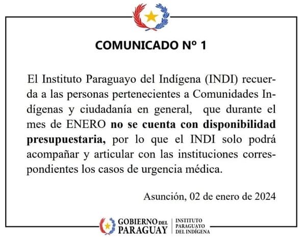 El Instituto Paraguayo del Indígena (Indi) enfrenta críticas por anunciar su falta de presupuesto para atender a los indígenas en enero, lo que desencadenó preocupación y llamados a la acción.