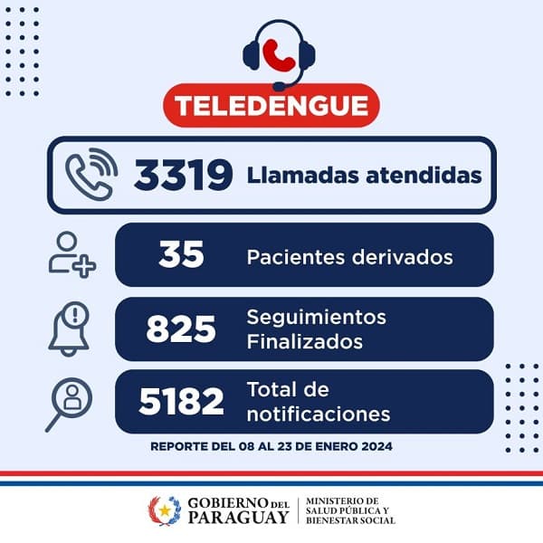Unite a nuestro canal de WhatsAppEl Ministerio de Salud desplegó Teledengue como respuesta al incremento de casos de dengue. Durante el periodo del 8 al 23 de enero, este servicio telefónico proporcionó vigilancia efectiva a 3.319 individuos, de los cuales 2.459 prosiguen en proceso de monitoreo, en tanto 825 recibieron el alta, y solo 35 requirieron volver a un hospital.