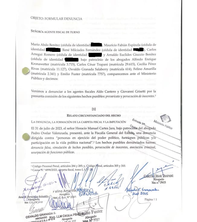 Los abogados defensores han presentado una denuncia contra los fiscales Aldo Cantero y Giovanni Grisetti por los presuntos delitos de prevaricato y persecución de inocentes, en el caso que involucra al expresidente Mario Abdo Benítez y varios de sus exfuncionarios.