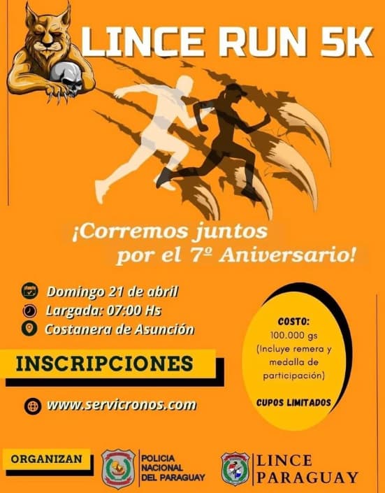 El Grupo Lince de la Policía Nacional celebrará su séptimo aniversario de actividad en las calles con una corrida popular de cinco kilómetros, prevista para el próximo domingo 21 de abril en la Costanera de Asunción. El evento deportivo, organizado por la propia fuerza del orden, contará con inscripciones abiertas a la ciudadanía a un precio simbólico de G. 100.000.