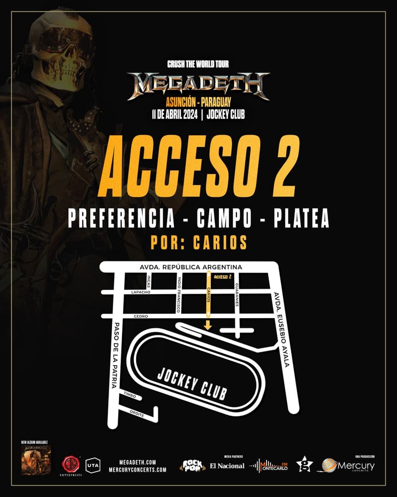Las puertas del Jockey Club se abrirán a las 18:00 horas, mientras que la banda local Kuazar dará inicio al espectáculo a las 20:10 horas, preparando el escenario para la llegada de Megadeth a las 21:30 horas.