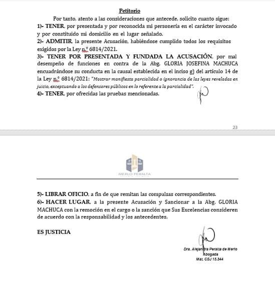 La abogada Peralta Merlo argumenta que esta medida viola el principio “iuria novit curiae”, que obliga a los jueces a conocer y respetar el texto constitucional. La imposición de una censura previa por parte de la magistrada, según la acusación, constituye una causal de remoción de su cargo.