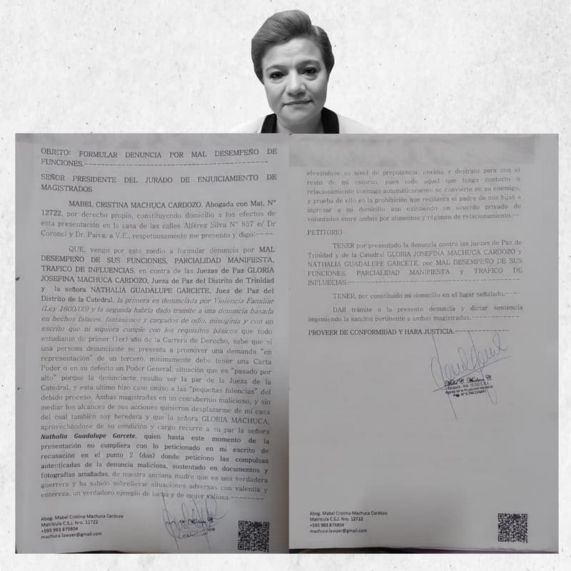 Además, Mabel Machuca presentó una denuncia ante el Jurado de Enjuiciamiento de Magistrados (JEM), acusando a Gloria Machuca y Natalia Garcete de mal desempeño en sus funciones y tráfico de influencias. Sin embargo, hasta el momento, la víctima no ha logrado avanzar en sus denuncias.