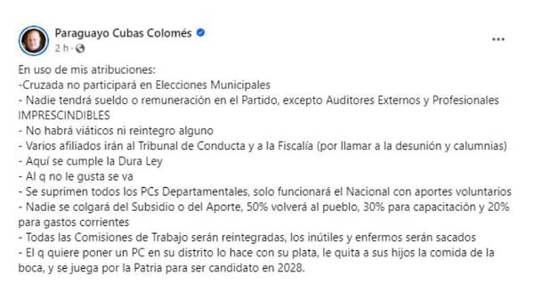 En su comunicado, Cubas decretó que, además de no participar en las elecciones municipales, no habrá sueldos ni remuneraciones para los afiliados del partido, a excepción de auditores externos y profesionales considerados imprescindibles. También se suprimirán los viáticos y cualquier tipo de reintegro, y se tomarán acciones disciplinarias contra varios afiliados que serán enviados al Tribunal de Conducta y a la Fiscalía por incitar a la desunión y hacer calumnias.
