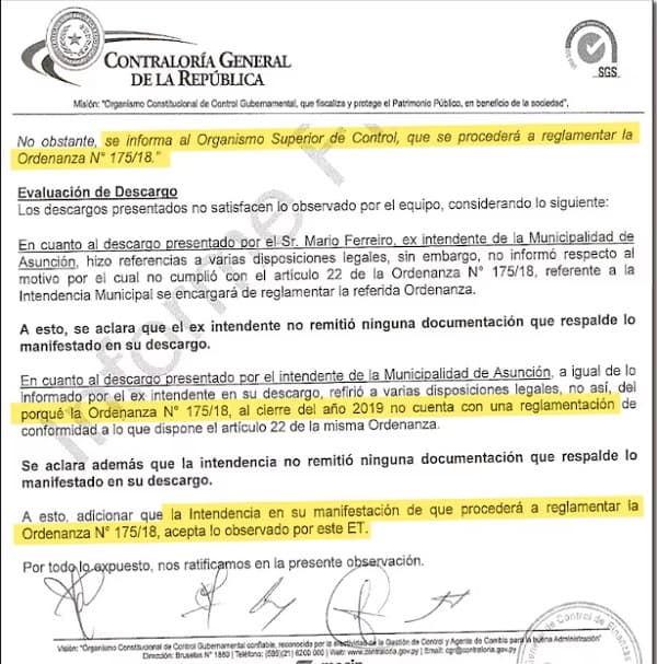 La CGR, en su informe de 2020, concluyó que hasta el 31 de diciembre de 2019, la Municipalidad de Asunción no había reglamentado la Ordenanza N° 175, que establece el régimen de títulos de deuda del municipio. Esta conclusión refuerza las dudas sobre la legitimidad del documento presentado recientemente por Rodríguez.