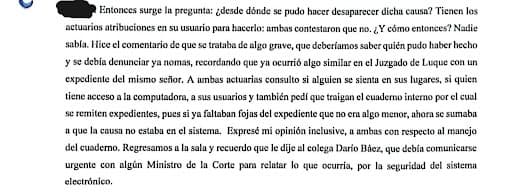 Sin embargo, el Juez Báez se opuso rotundamente a que se realizara la denuncia ante el Ministerio Público; llamativa reacción de quien debería ser el más interesado en saber quién vulneró el sistema afectando una causa en su Juzgado.