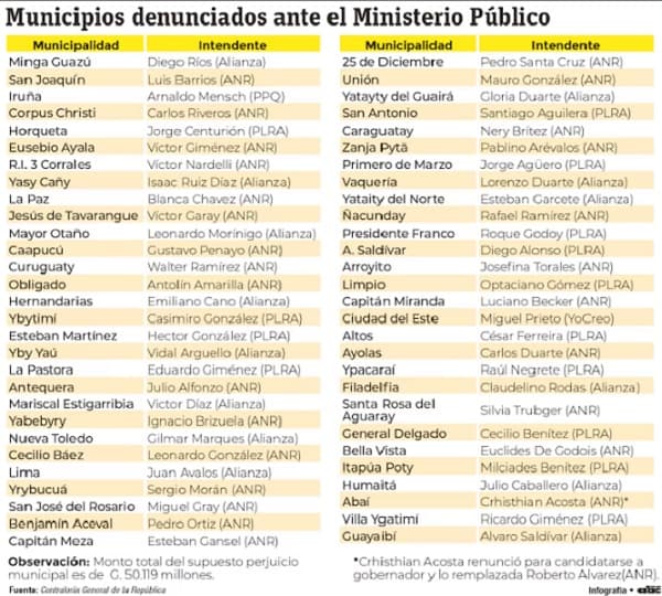 Entre los municipios que se han librado de investigaciones se cuentan 27 administraciones coloradas, 13 liberales, 14 aliancistas, una patriaqueridista y una del Partido Yo Creo. Esta situación refuerza la percepción de que la Contraloría ha sido reducida a un papel meramente decorativo.