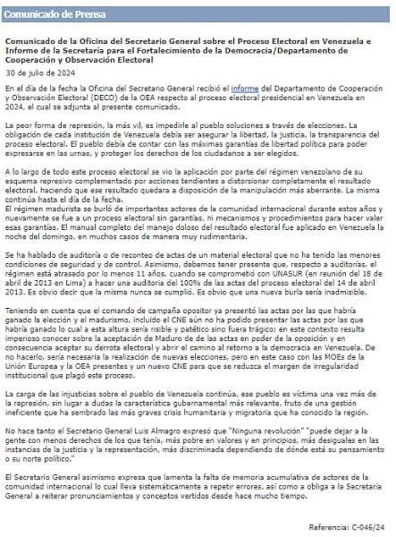 Por su parte, la oposición antichavista asegura poseer el 73% de las actas emitidas durante las elecciones presidenciales, las cuales, según afirmaron, demuestran una victoria contundente de González Urrutia. Esta discrepancia entre los datos oficiales y los presentados por la oposición exacerbó las tensiones políticas en el país y motivó el pronunciamiento de la OEA.