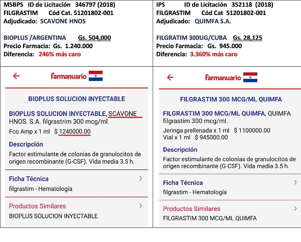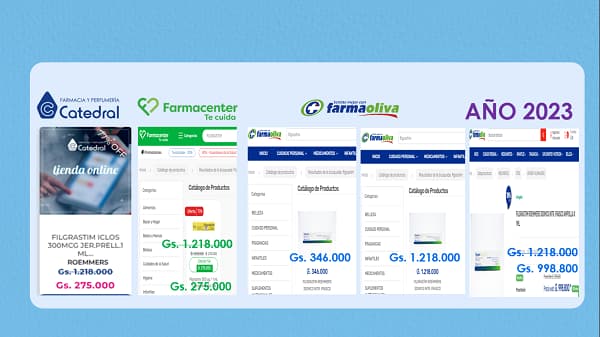 La investigación reveló diferencias de precios alarmantes entre el sector público y privado. Por ejemplo, FILGRASTIM, que en licitaciones públicas se adquirió por Gs. 28.125 en IPS y por Gs. 504.000 en el Ministerio de Salud Pública y Bienestar Social (MSPBS), se vendió en farmacias del sector privado a Gs. 1.240.000 y Gs. 945.000 en el 2018, lo que representa un aumento del 246% y 3.360%, respectivamente. Esta diferencia no puede explicarse únicamente por costos operativos o márgenes de ganancia razonables.