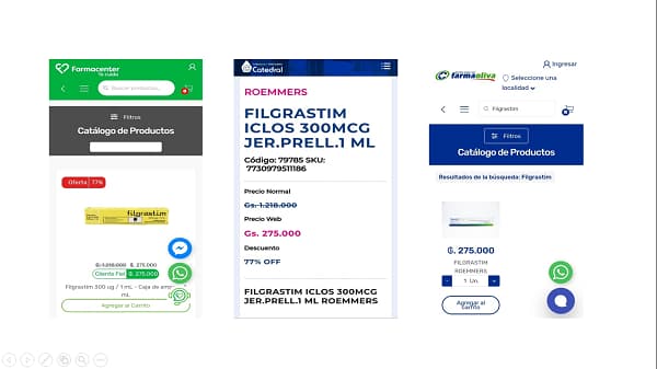 Ante esta situación, muchos paraguayos se ven obligados a buscar alternativas en países vecinos. La ciudad argentina de Clorinda se ha convertido en un destino popular para la compra de medicamentos oncológicos. Por ejemplo, el FILGRASTIM, que en farmacias paraguayas se vende a más de 1 millón de guaraníes, puede encontrarse en Clorinda donde los precios sin descuento en farmacias son abismalmente más bajos. Consultamos con farmacias de la ciudad del país vecino y estos fueron los precios que nos proporcionaron: